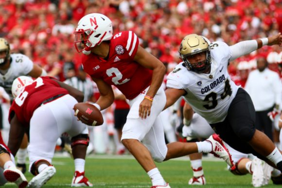 Sophomore DB looks to tackle Husker QB Adrian Martinez during the third quarter of play at Memorial Stadium. Sept. 8, 2018 (Nigel Amstock/CU Independent) Nigel Amstock