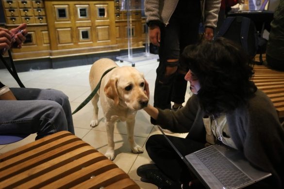 “It makes me feel really relaxed because I’m constantly worrying about finals, constantly worrying about keeping my grades up in order to get scholarships,” said CU student Michelle Valdez while she petted Cooper, an English Labrador. “It’s just nice to sit and relax and enjoy the company of a … pet.”
