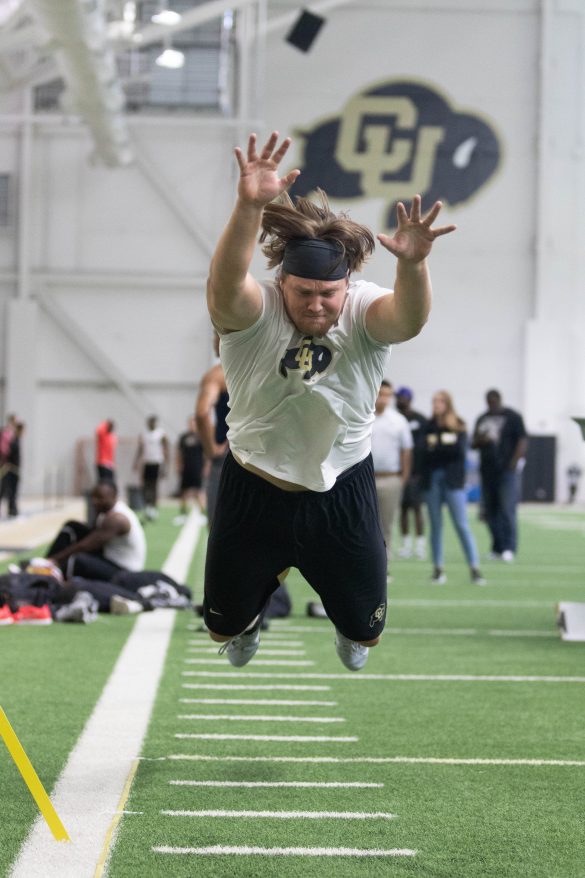 Tim Lynott presses down on pads during a drill for offensive linemen during the 2020 NFL Draft Pro Day. March 11, 2020 (Kara Wagenknecht/CU Independent)