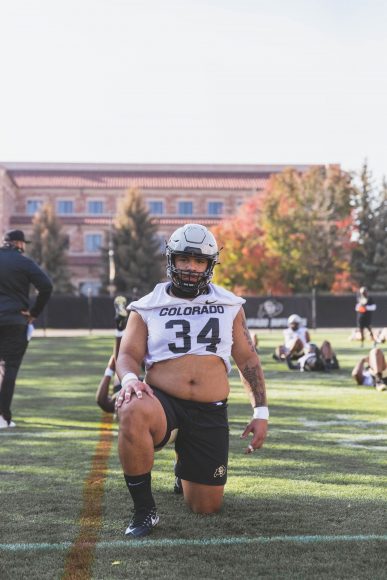 Buffs’ defensive end Mustafa Johnson stretching out prior to practice at Franklin Field on Oct. 10. (Courtesy CU Athletics)
