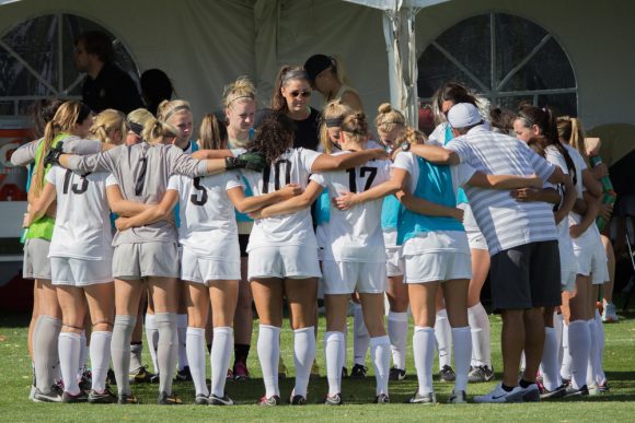 The CU soccer team huddles up before kickoff against No. 18 Washington. (Matt Sisneros/CU Independent File)