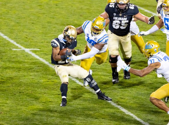 Sophomore tailback Jarek Broussard gets tackled by his opponent, the UCLA Bruins, during the first half of play. Nov. 7, 2020 (Casey Paul CU Independent)