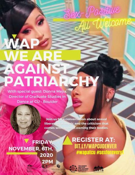 On Friday, Nov. 6, University of Colorado Denver and Sweeann Moreno, graduate assistant and researcher in Latinx Student Services and Center for Identity and Inclusion, hosted a discussion entitled “WAP: We Are Against Patriarchy” with special guest Donna Meija, CU Boulder’s director of graduate studies in dance. The discussion aimed to create a dialogue about sexual liberation in music, focusing on social criticism of female body positivity and sexuality, particularly in relation to the well-known song, “WAP”.