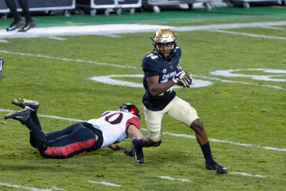 Sophomore running back Jarek Broussard looks to evade Aztec defenders during the second quarter of play at Folsom Field. Nov. 28, 2020 (Nigel Amstock/CU Independent)