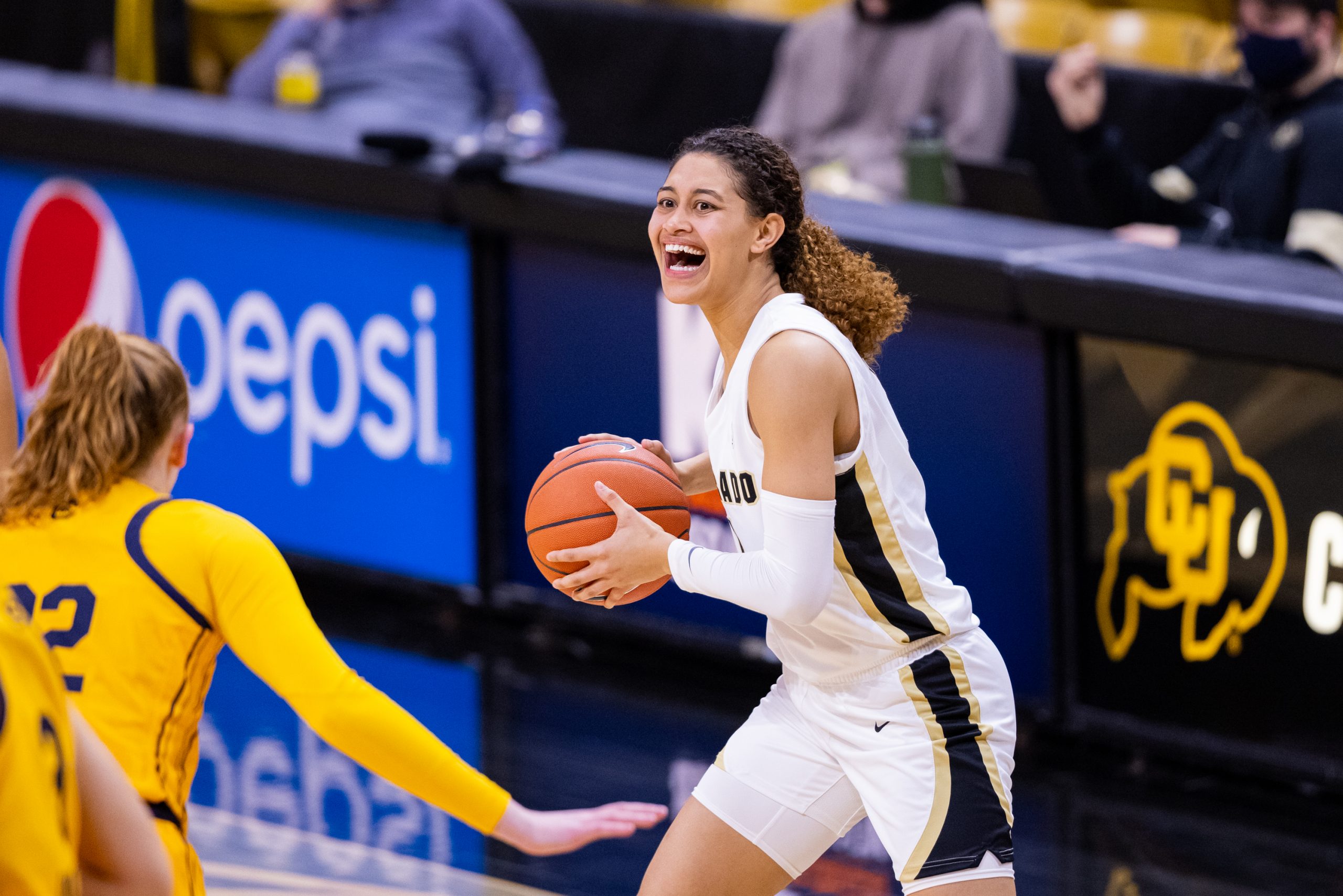 Senior forward Mya Hollingshed looks to pass the ball during the second quarter of play at the CU Events Center. Jan. 15, 2021 (Nigel Amstock/CU Independent)