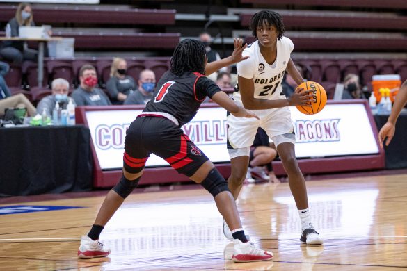 Freshman forward Frida Foreman drives the ball down the court during the opening round of the WNIT at My Town Movers Fieldhouse. March 19, 2021 (Nigel Amstock/CU Independent)