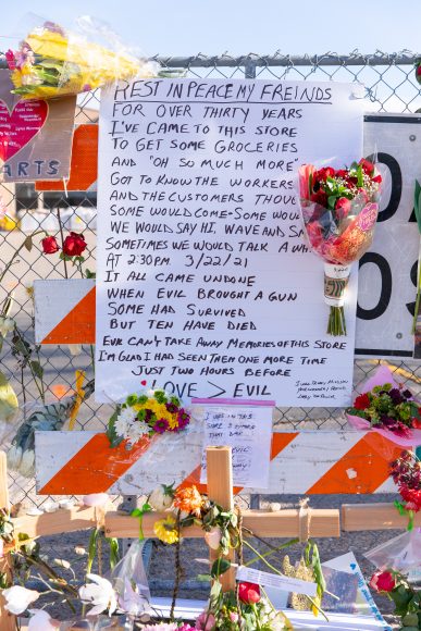 People of the community share their love and support through flowers, signs, and homemade crosses. March 27, 2021 (Casey Paul / CU Independent)