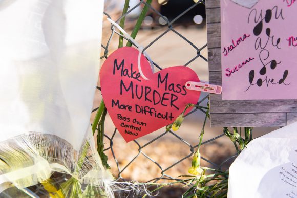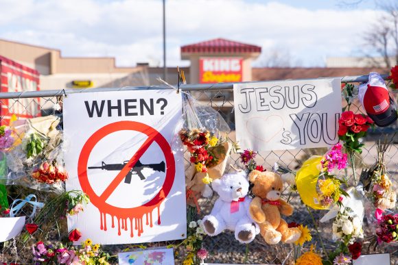 Signs about gun reform line the fence in front of King Soopers. March 27, 2021 (Casey Paul / CU Independent)