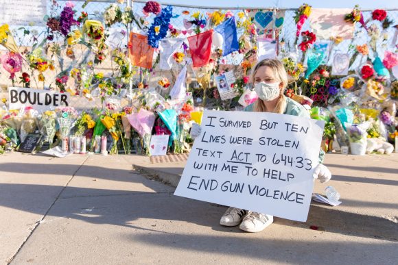 A survivor sits outside of the Table Mesa King Soopers for hours on end holding a sign pleading for people to help her end gun violence. March 27, 2021 (Casey Paul / CU Independent)
