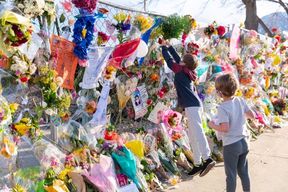 Two young boys hang flowers in the fence for the 10 victims. March 27, 2021 (Casey Paul / CU Independent)