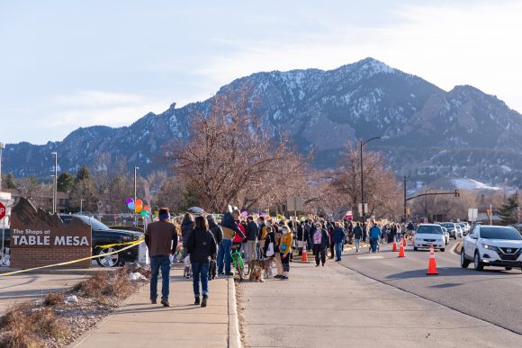 Hundreds walk the sidewalk admiring the flowers and mourning the 10 lives that were taken. March 27, 2021 (Casey Paul / CU Independent)