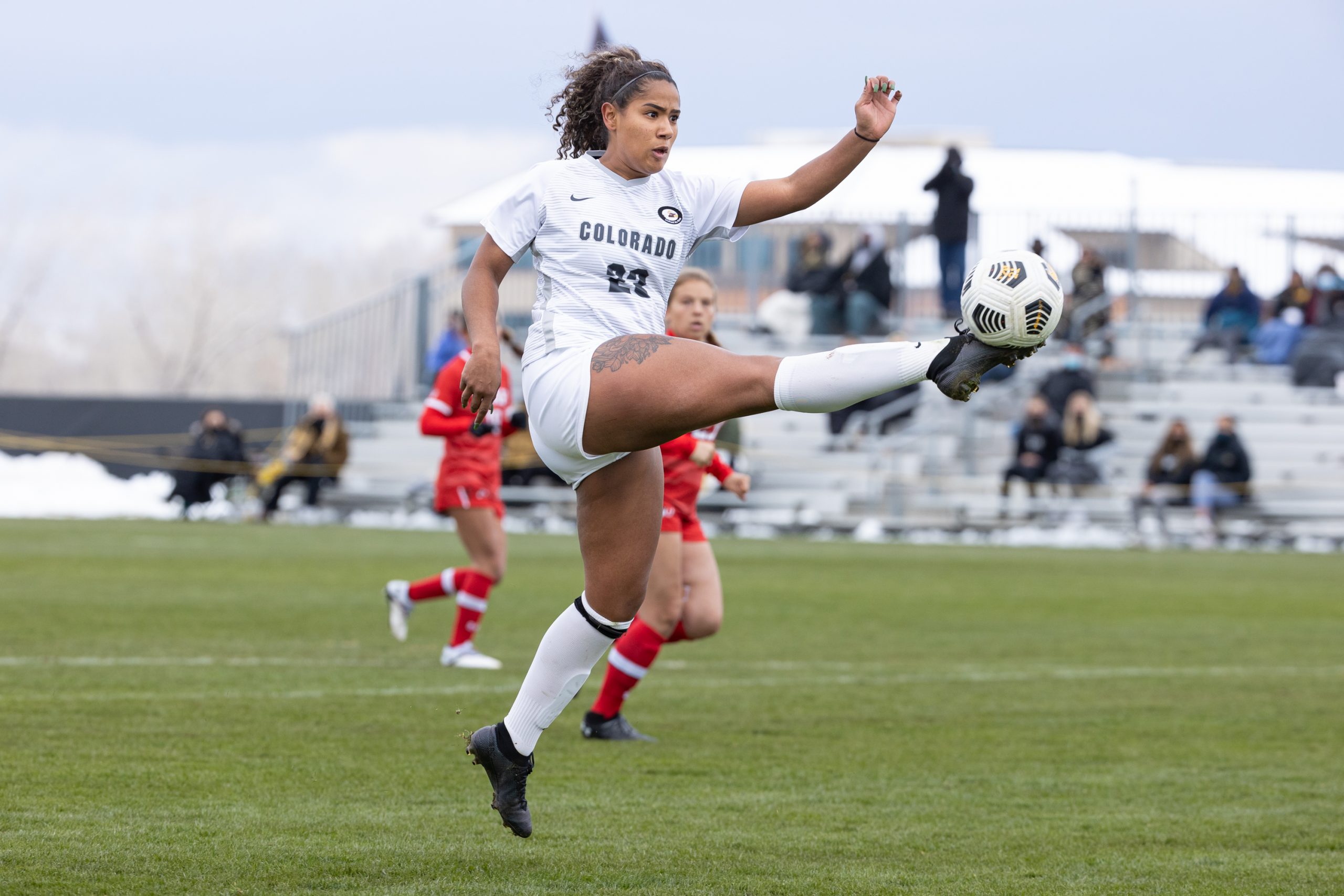 Senior midfielder Shanade Hopcroft drives the ball down the field during the first half of play at Prentup field. April 16, 2021 (Nigel Amstock/CU Independent)