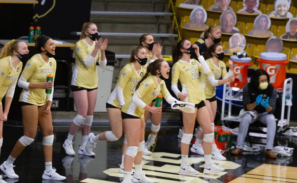 Members of the CU women’s volleyball team cheer on their teammates from the sidelines. March 7, 2021 (Kevin Wu/CU Independent)
