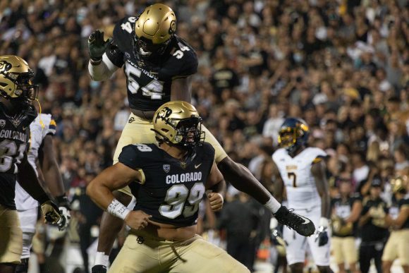 Junior defensive end Terrance Lang jumps in celebration with sophomore nose tackle Jalen Sami. Sept. 3, 2021 (Kara Wagenknecht/CU Independent)