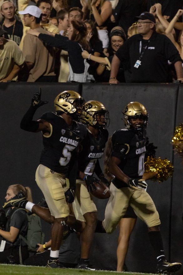 The Buffs celebrate freshman wide receiver Montana Lemonious-Craig’s touchdown during the second quarter on Sept. 3, 2021. (Kara Wagenknecht/CU Independent)