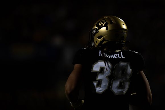 Junior tight end Brady Russell awaits for the play to begin during the third quarter on Sept. 3, 2021. (Kara Wagenknecht/CU Independent)