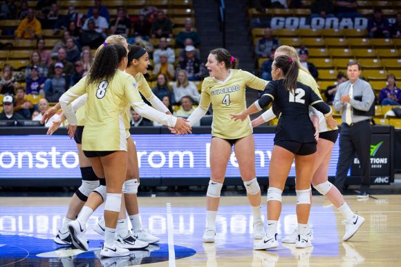 The CU Women’s Volleyball team congratulates one another on another point. Oct. 27, 2019 (Casey Paul/CU Independent)