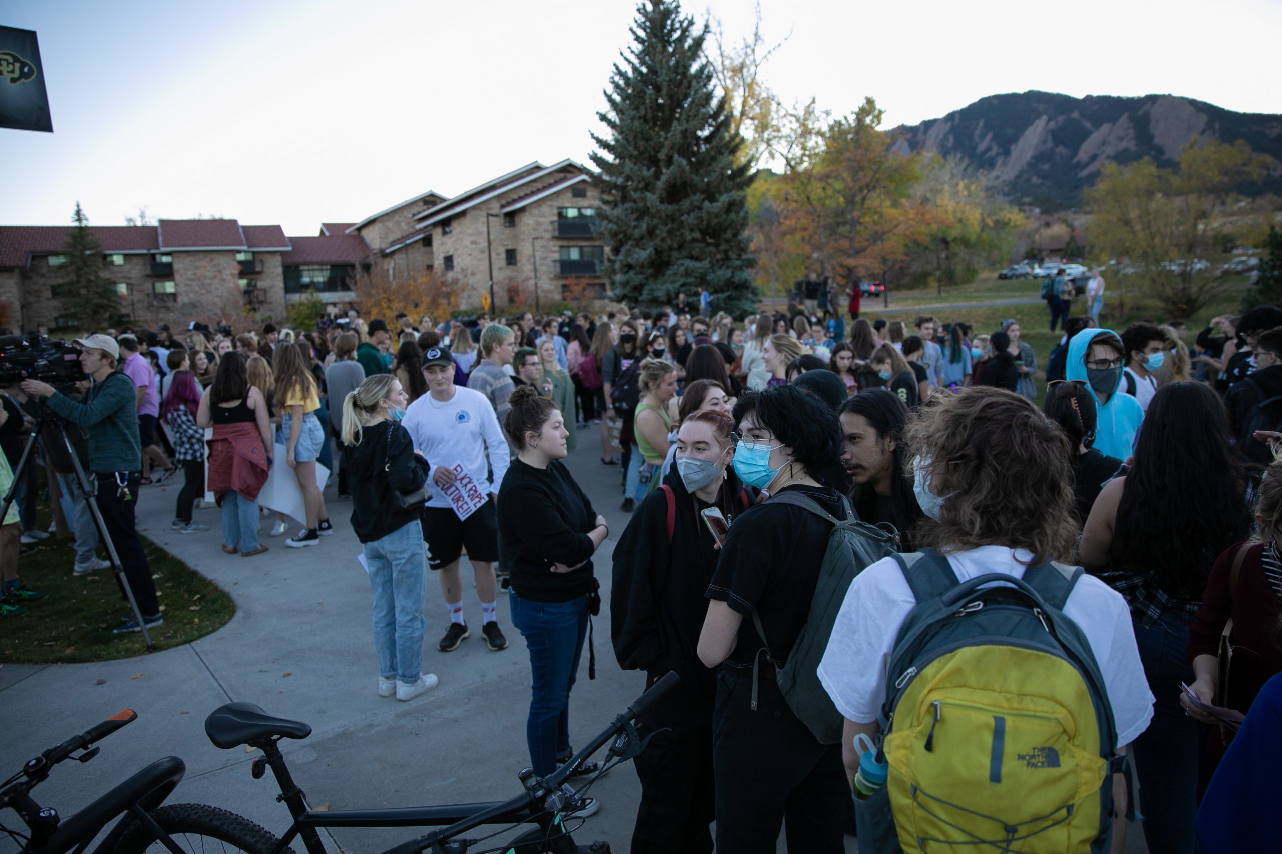 Protesters remained outside CU Boulder’s PIKE fraternity after being there for about 1 hour on Friday, Nov. 5, 2021. (Io Hartman/CU Independent)