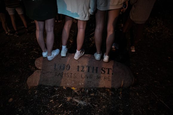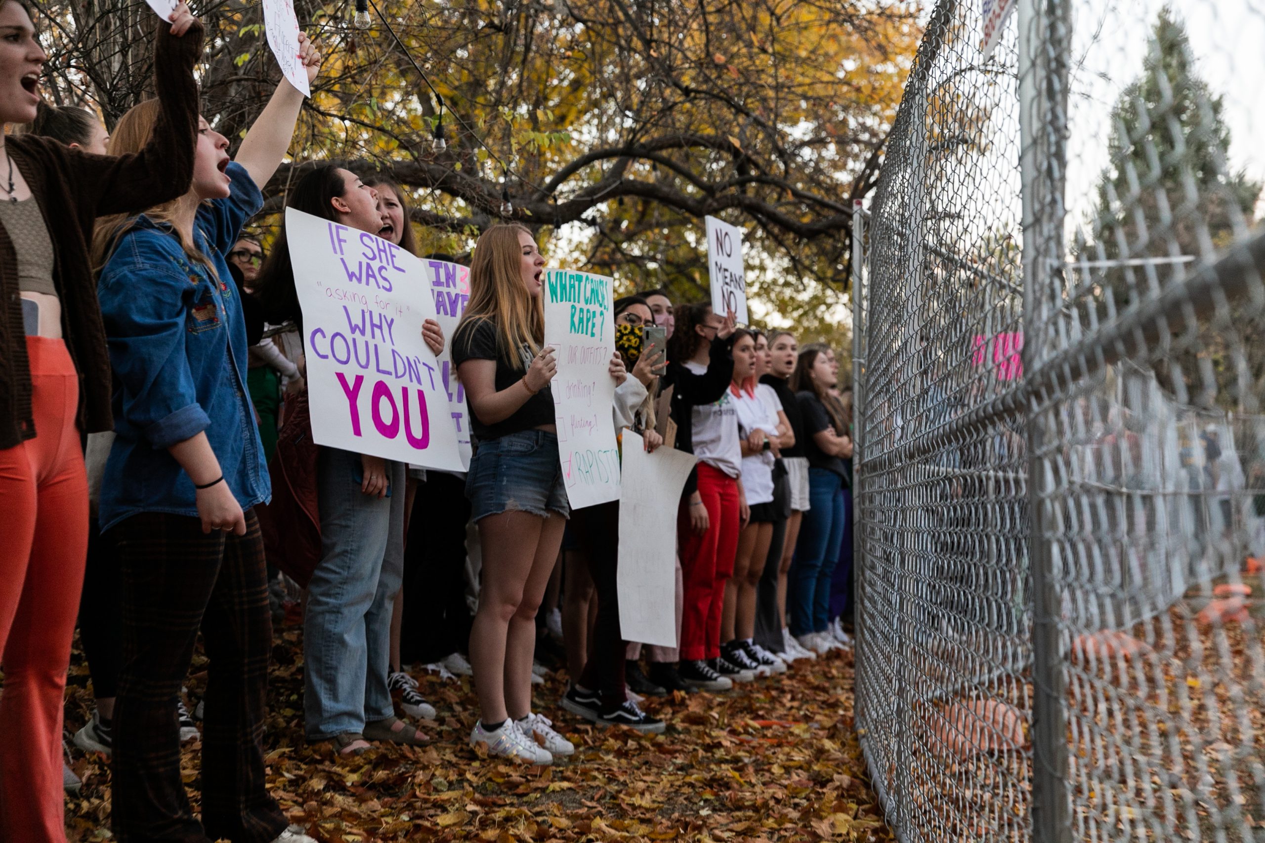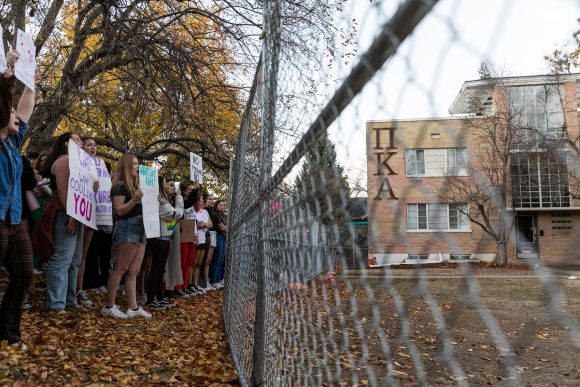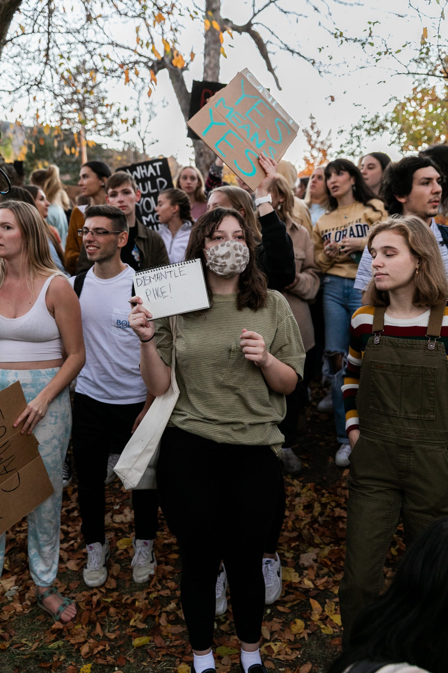 Students gathered outside CU Boulder’s PIKE fraternity on Friday, Nov. 5, 2021, to protest rape culture and campus sexual assault. (Io Hartman/CU Independent)