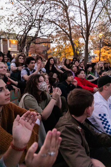 Students sit in silence, listening to a speaker talk about their experience with sexual assault during the protest against PIKE fraternity on Friday, Nov. 5, 2021. (Io Hartman/CU Independent)