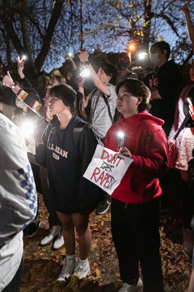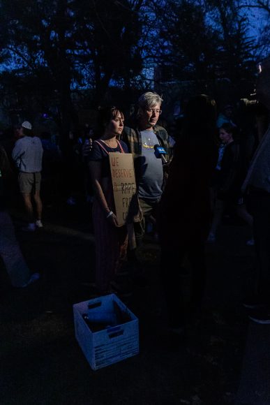 The crowd clapped and cheered in response to the speakers, while students on the other side of the street watched. As the night continued, the crowd became more agitated and, in response to an increased police presence, more antagonistic. Around 6:40 pm, the crowd shined their flashlights and shouted more at the fraternity house, frustrated by the lack of engagement from the fraternity brothers, who did not engage with the crowd all night.