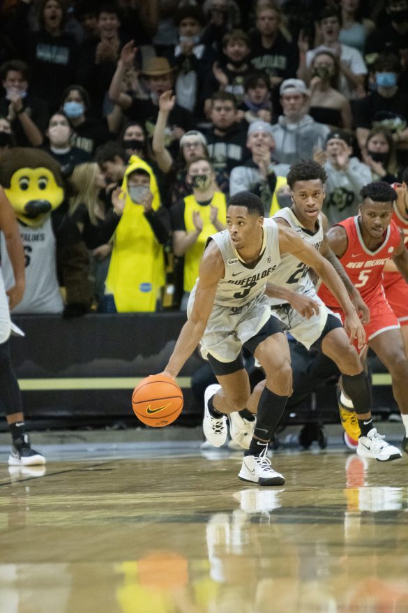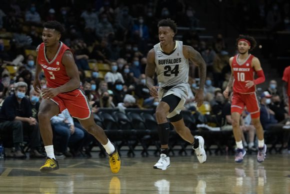 Senior guard Elijah Parquet chases down a loose ball against New Mexico on Nov. 13, 2021. (Brett Robinson/CU Independent)