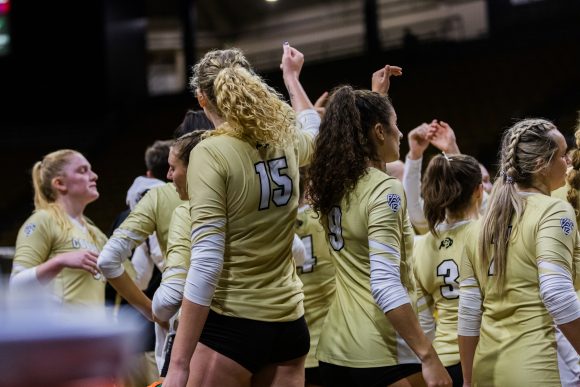 CU Boulder’s volleyball team meets during a time-out during the game against Texas Tech on Sept.10, 2021. (Io Hartman/CU Independent)