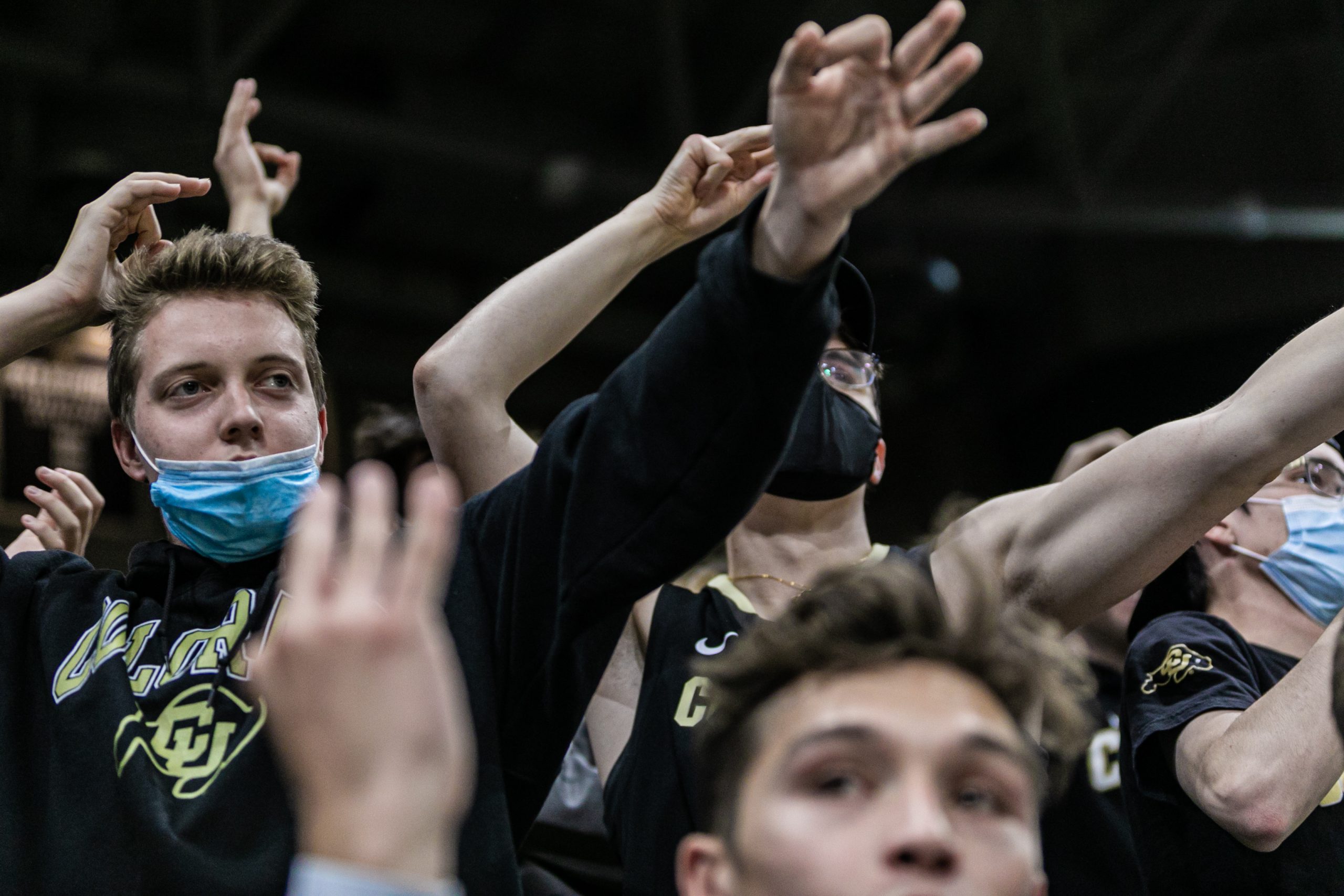 Senior forward Evan Battey (21) greets fans after winning the game against Stanford on Sunday, Nov. 28th, 2021. (Io Hartman/CU Independent)