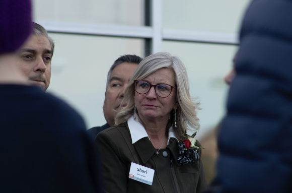 The store leader of the Table Mesa King Soopers watches speaker during ceremony. (Zoe Schacht/CU Independent)