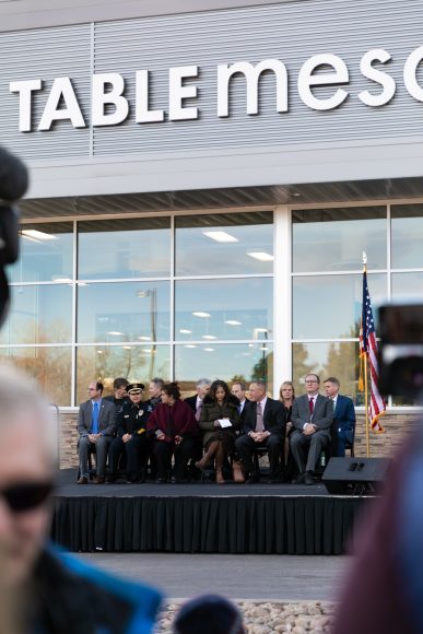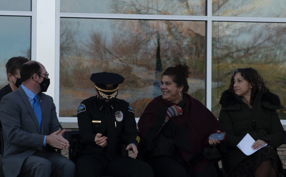 Boulder’s Table Mesa King Soopers store managers and members of the Colorado Healing Fund sit on the stage during the opening ceremony on the morning of Wednesday, Feb. 9, 2022. (Io Hartman)