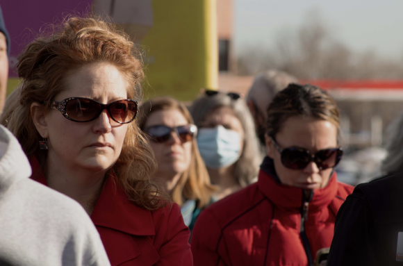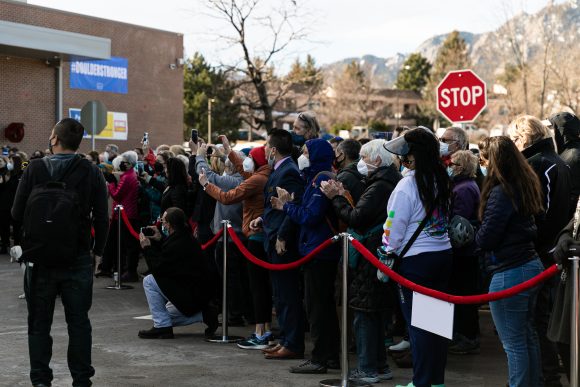 People watch and applaud on the sidelines as King Soopers employees enter the store for the re-opening of King Soopers on Wednesday, Feb. 9, 2022. (Io Hartman/CU Independent)