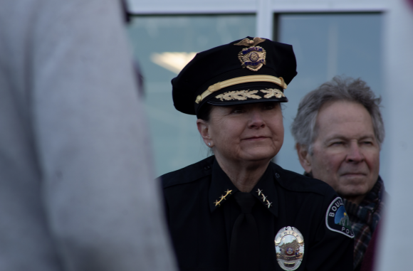 Boulder Police Chief Maris Harold smiles on stage during the ceremony. (Zoe Schacht/CU Independent)