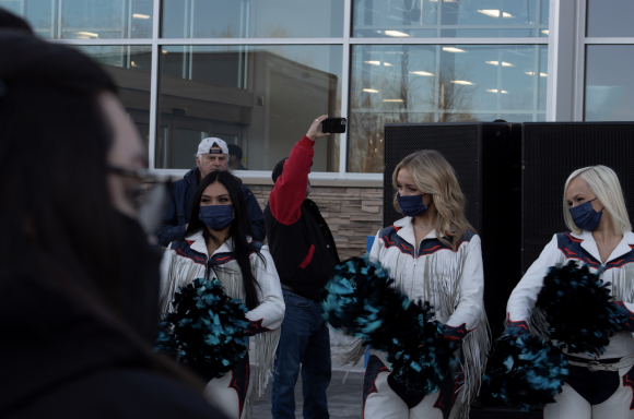 Cheerleaders and marching band open the ceremony for the re-opening of King Soopers on Wednesday, Feb. 9th, 2022. (Io Hartman/CU Independent)