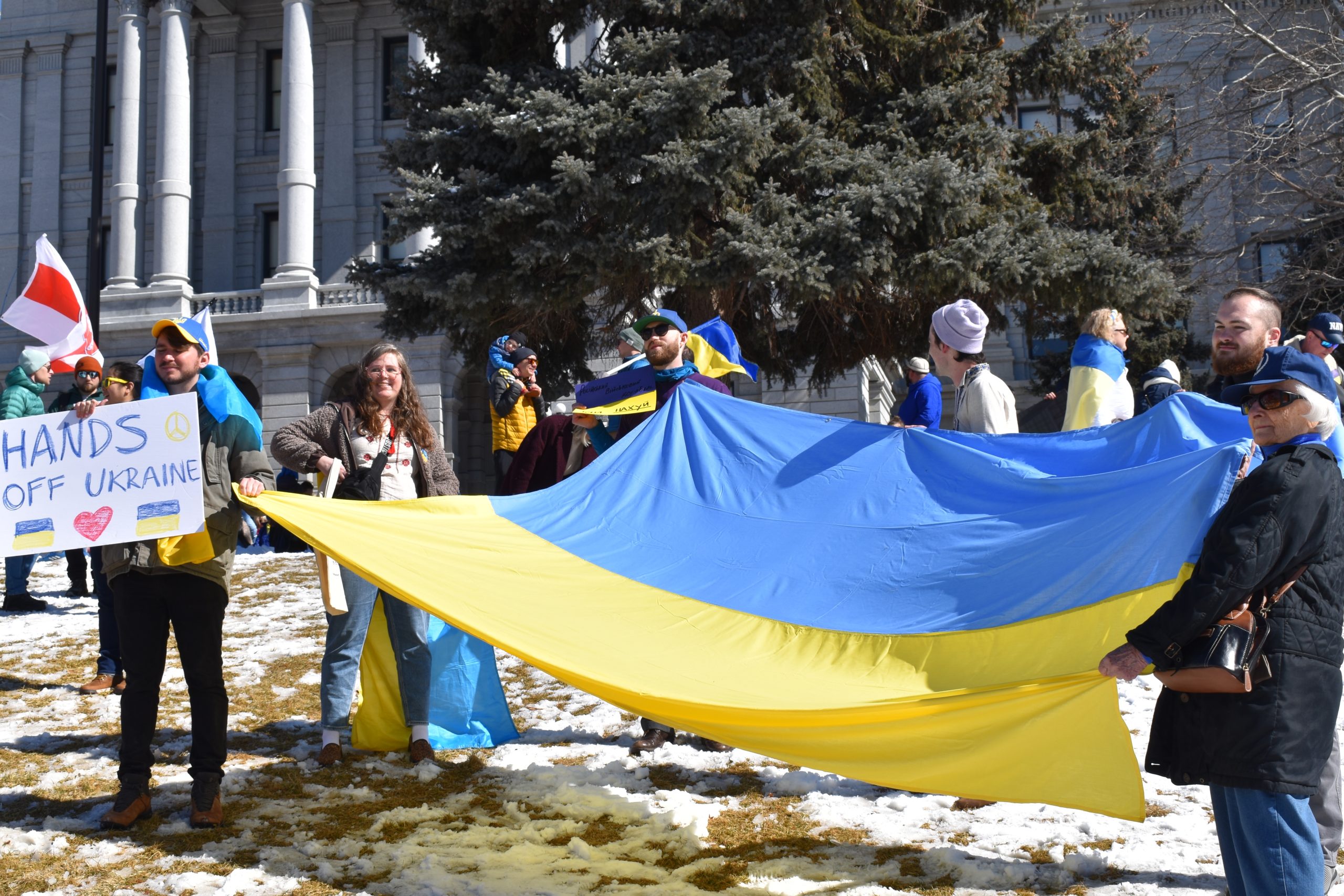 A group of people stand together to hold the Ukrainian flag above the ground. They held this position for over 30 minutes. (Isabella Hammond/CU Independent)