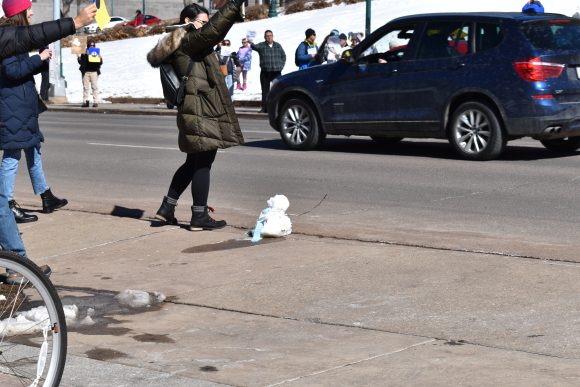 A snowman sits at the edge of the sidewalk, sporting a scarf made of Ukrainian blue and yellow streamers. (Isabella Hammond/CU Independent)
