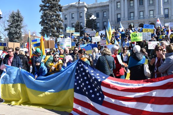 The Ukrainian and United States flags held together at the front of the rally. (Isabella Hammond/CU Independent)
