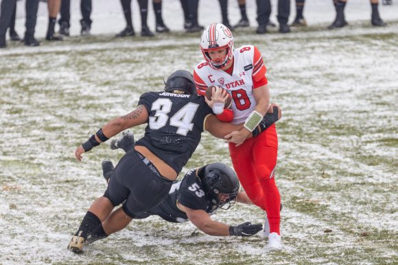 Utah QB Jake Bentley looks to evade the sack by defenders Nate Landman (53) and Mustafa Johnson (34) during the first quarter of play at Folsom Field. Dec. 12, 2020 (Nigel Amstock/CU Independent)