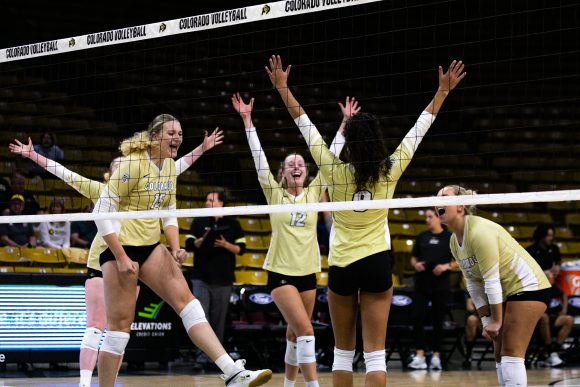 The University of Colorado Boulder’s women’s volleyball celebrate scoring against Western Michigan in the third set of the game on Friday, Aug. 22, 2022. (Io Hartman/CU Independent)