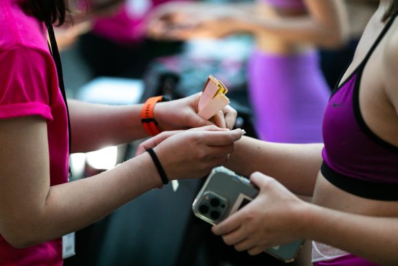 Nearly Naked Mile staff checked students in with their BuffOne cards and provided them with wristbands for food and drinks after their runs. Thursday, Sept. 29, 2022. (Io Hartman/CU Independent)