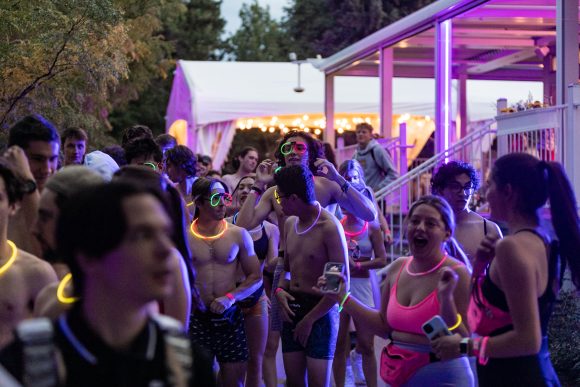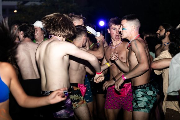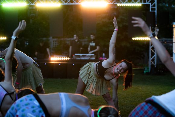 Students dance in the Koenig Alumni Center’s yard after finishing the Nearly Naked Mile on Thursday, Sept. 29, 2022. The scene was showered with glow-stick necklaces, bright and colorful undergarments and body paint. (Io Hartman/CU Independent)