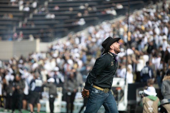 A member of this school year’s Ralphie Handlers engages with the crowd during the game at Folsom Field on Saturday, Oct. 15, 2022. (Io Hartman/CU Independent)