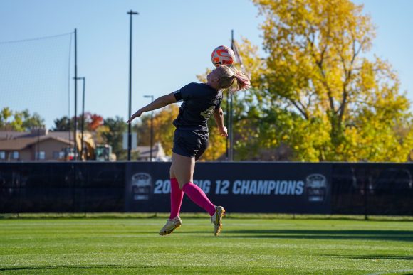 Senior Forward Civana Kuhlmann heads the ball during the game against UCLA on Thursday, Oct. 20, 2022 at Prentup Field. (Rachel Glazer/CU Independent)