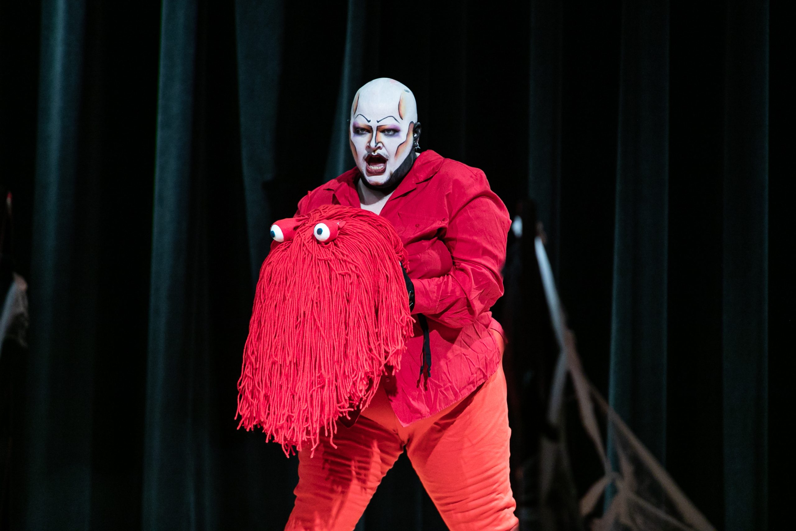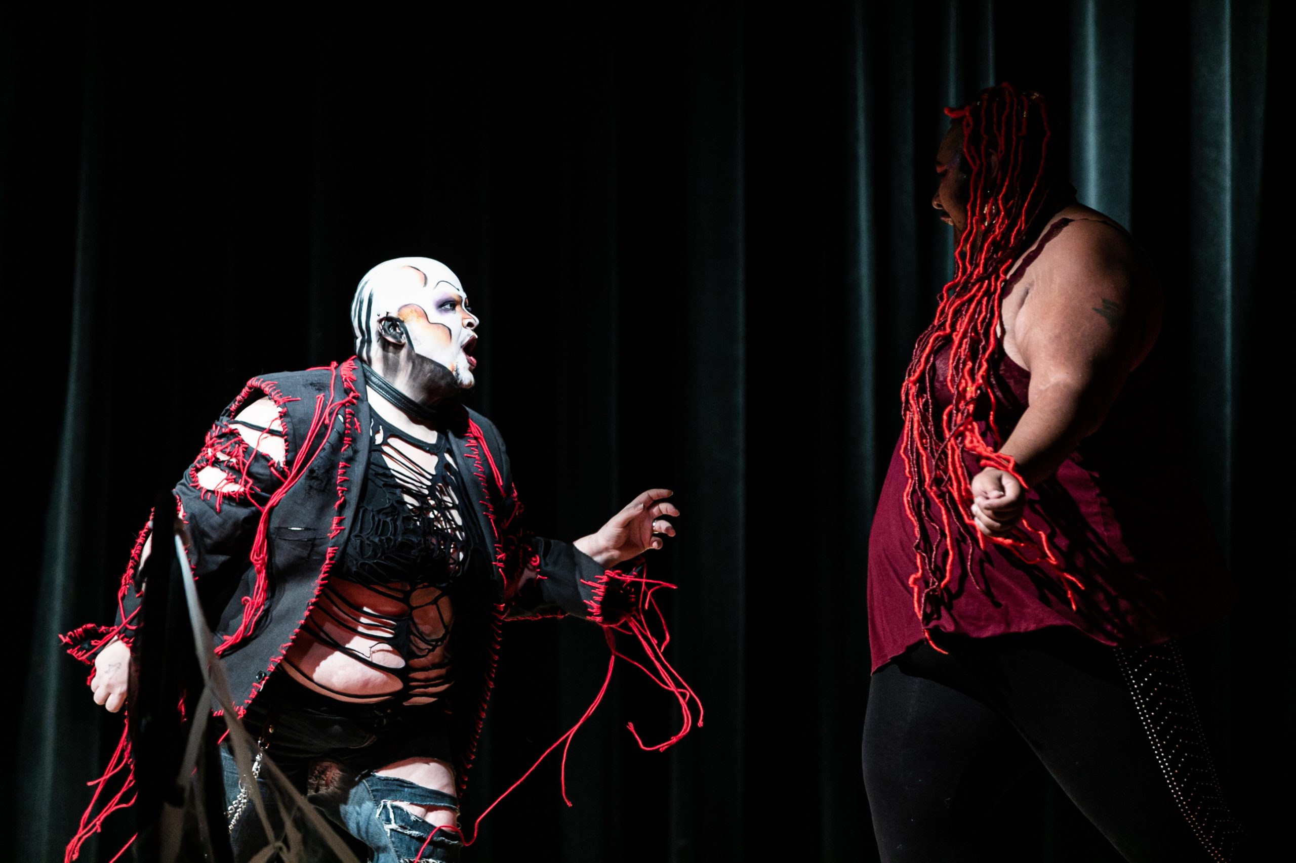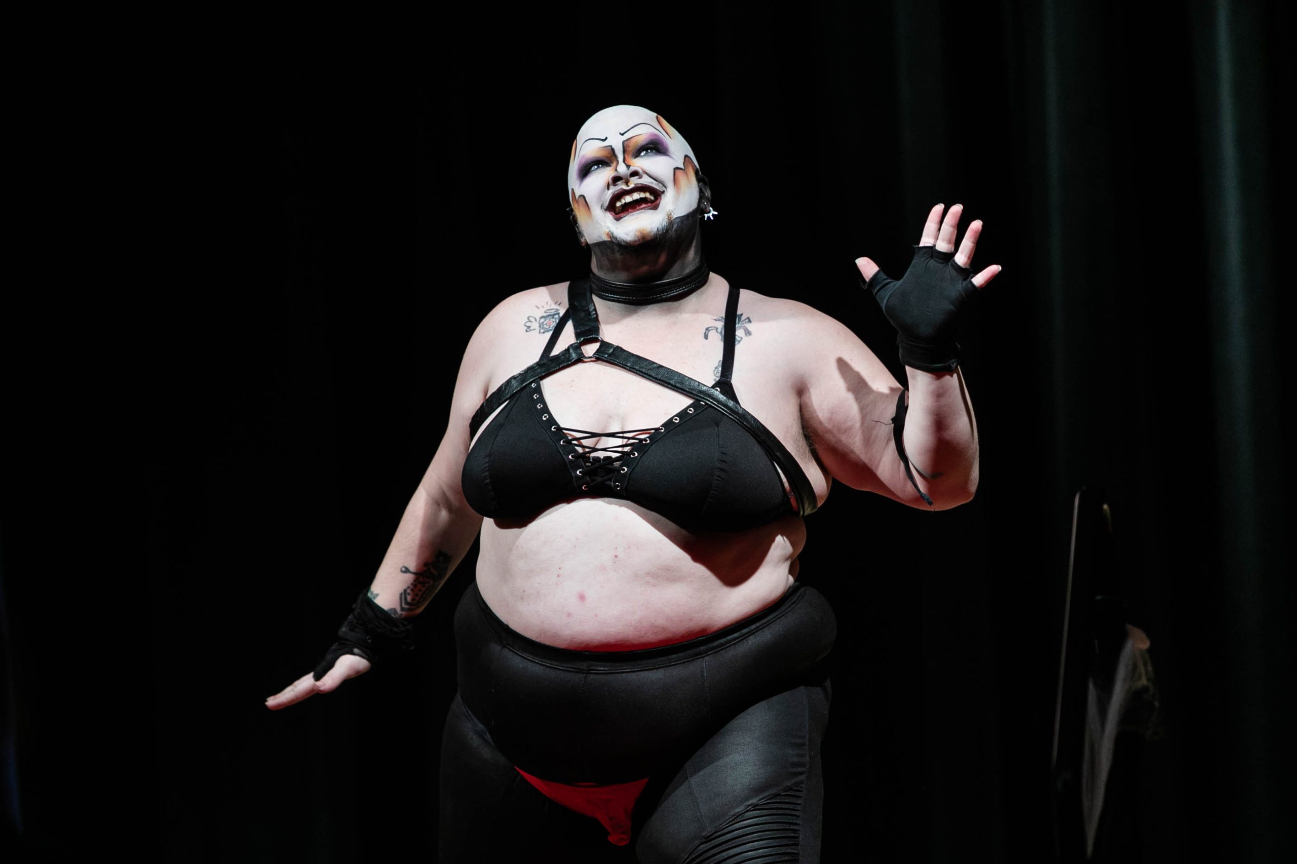 Then, the freakiness began. Calder Goodlay waltzed onstage dressed as the Red Puppet from the comedy-horror internet series “Don’t Hug Me I’m Scared,” wearing a neon red outfit with a massive costume headpiece. As hard rock music blared, he danced and stripped off this outfit, revealing grotesque skeleton makeup and a black crop top.