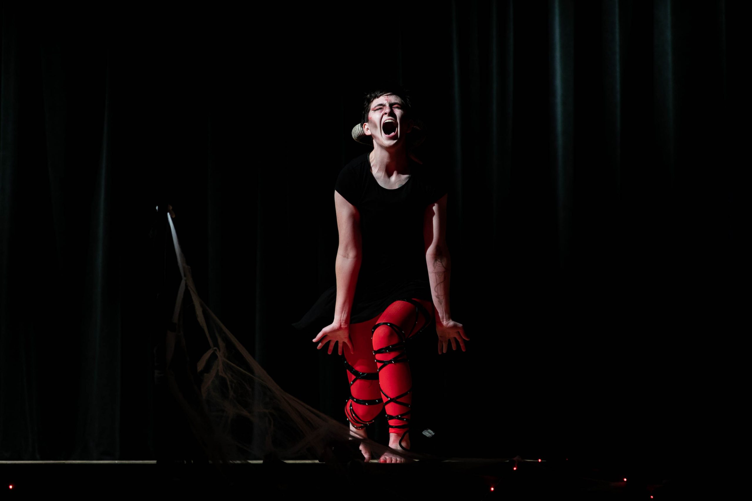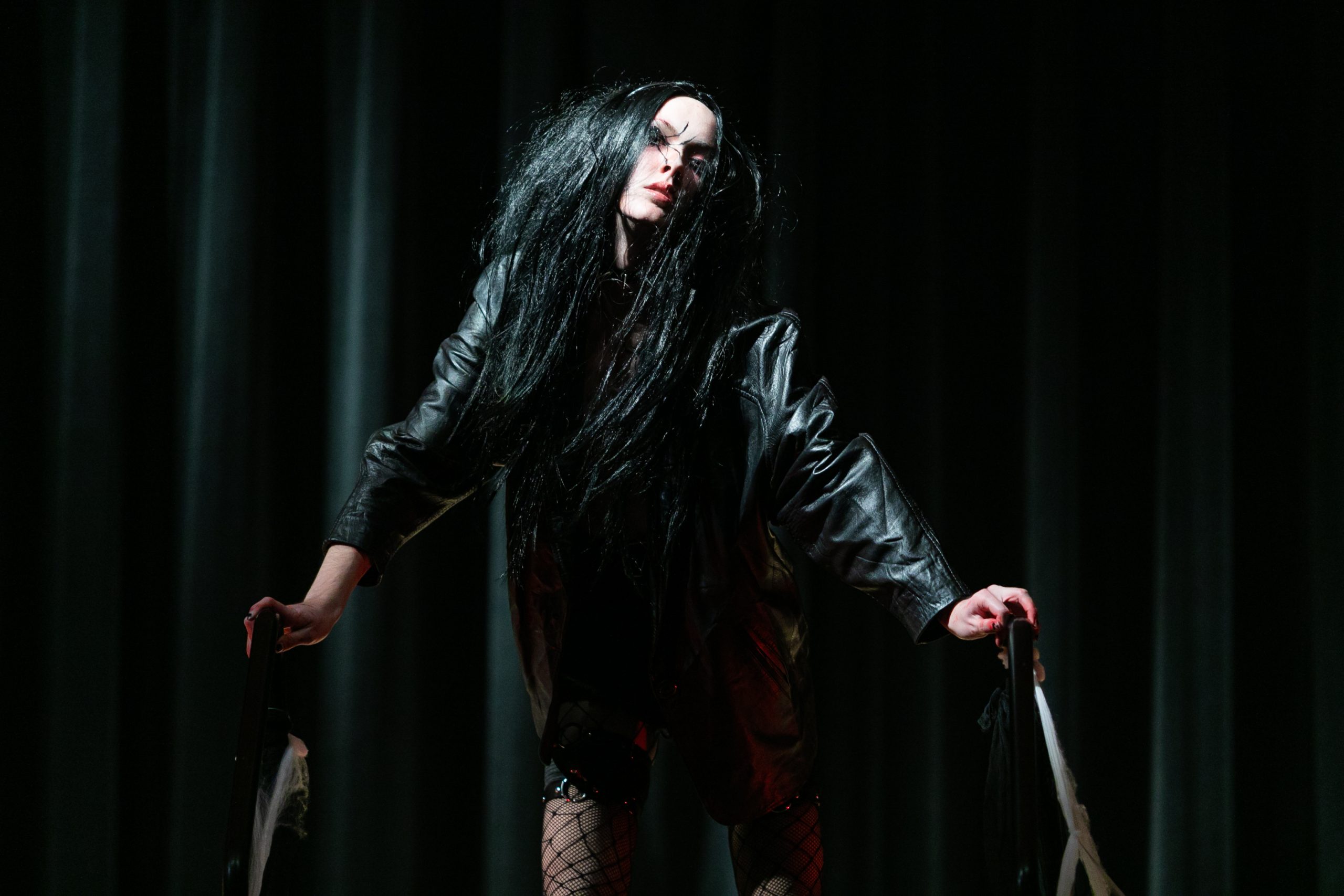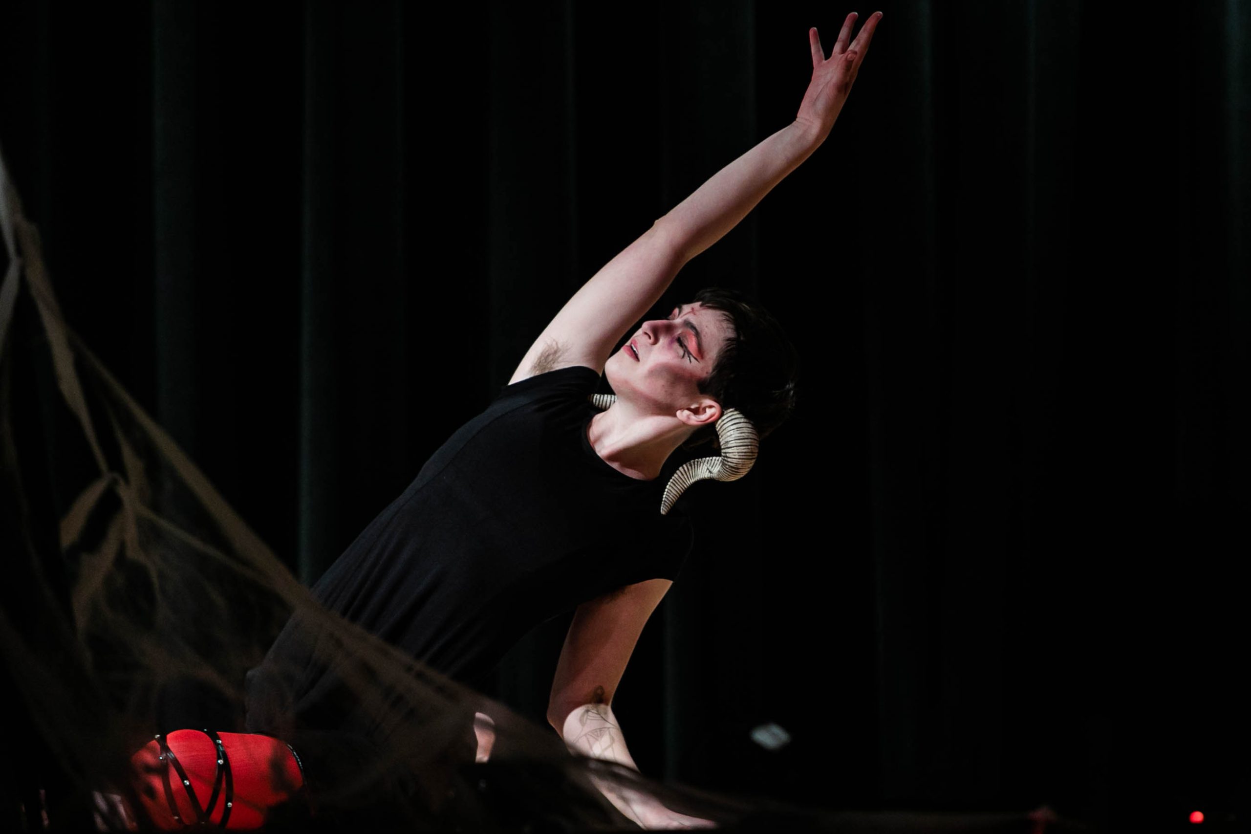Then, the freakiness began. Calder Goodlay waltzed onstage dressed as the Red Puppet from the comedy-horror internet series “Don’t Hug Me I’m Scared,” wearing a neon red outfit with a massive costume headpiece. As hard rock music blared, he danced and stripped off this outfit, revealing grotesque skeleton makeup and a black crop top.