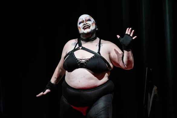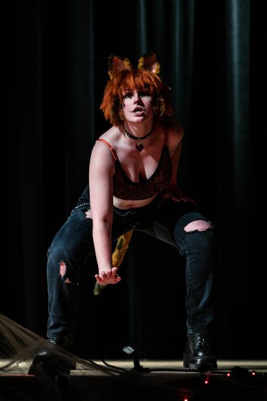 Little Meow Meow, dressed as ‘sexy Garfield,’ performed onstage at the University Memorial Center on Oct. 23, 2022. (Io Hartman/CU Independent)