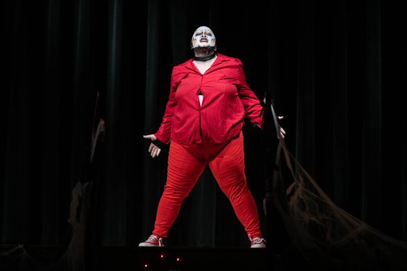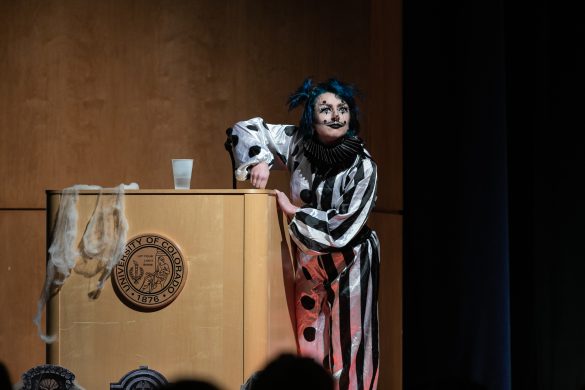 Drag clown Mo Whoremoans performs their set for an engaged audience during the Halloween-themed drag show at CU’s University Memorial Center on Sunday, Oct. 23, 2022. (Io Hartman/CU Independent)