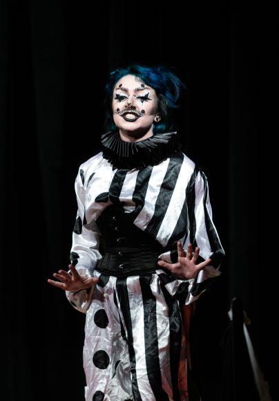 Drag clown Mo Whoremoans embraces the silly and fun side of horror. With their black and white, striped and polka dot jumpsuit, mermaid blue hair and mime makeup, they look like a far less scary version of Art the Clown, the demonic character from the horror film “Terrifier.” Onstage, Mo Whoremoans puts on a frenzied, circus-like routine with miming, dancing and even a rubber chicken.