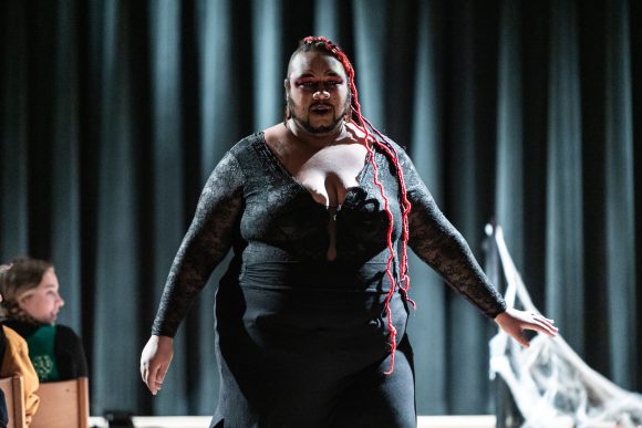 Drag host and performer Wild Cherry Quartz walked through the aisle in the audience during their performance on Oct. 23, 2022. (Io Hartman/CU Independent)