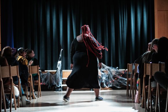 Professional drag queen Kat Danger performs for students on CU’s Glen Miller Ballroom stage on Sunday, Oct. 23, 2022. (Io Hartman/CU Independent)