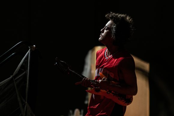 Drag performer King Vaughnz Spanic played a blow up electric guitar during his performance from High School Musical as Troy Bolton. Taken in the Glen Miller Ballroom in Boulder on Sunday, Oct. 25, 2022. (Io Hartman/CU Independent)